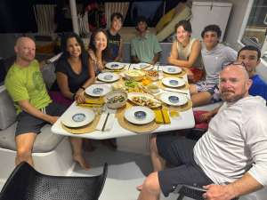 Following his superyacht years, he returned to NZ to pursue a bachelor's degree in marine and coastal ecology, which is where he met his wife, Chef Olivia. After graduating, the two went on to live a life of adventure. Starting out renovating their home and living a self-sufficient life on 10 acres in the remote bush of West Coast, NZ. They spent 3 years renovating their property and learning to grow enough food to feed their new family. Their first child, Ivy was born there followed by another, Angus. By the time the third was due the pair had had their fill of the wild country and were ready to return to the pristine beaches and ideal boating grounds of the winterless North (of NZ that is). They had their third child there and spent the next couple years enjoying all that Northland had to offer. Fraser got a job as engineer on a coastal tug and barge then was handpicked by the company owner to run their oyster farm operation. However Fraser soon began to get itchy feet and felt as though he was starting to dry out so he began to search for catamarans.