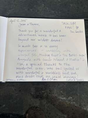 Jason & Therese, Thank you for a wonderful & adventurous week. It has been beyond our wildest dreams! So much fun & so many experiences — snorkeling with colorful fish; Monkey Point & The Baths — wow! Anegada with Conch Island & Mathilda! :) Also, a special thanks to the wonderful crew, who has spoiled us with wonderful & world-class food and more drinks than we could manage! TACK SOM FAN! ❤️ The Swedes Johanna & Love Åsa & Johan Lotta & Jonas