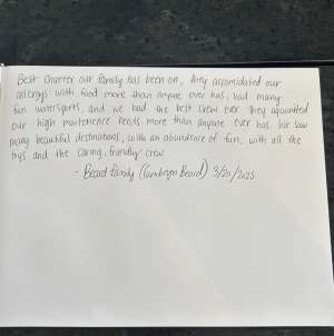 Best charter our family has been on, they accommodated our allergies with food more than anyone ever has, had many fun watersports, and we had the best crew ever. They acquainted our high-maintenance needs more than anyone ever has. We saw many beautiful destinations, with an abundance of fun, with all the toys and the caring, friendly crew. — Beard Family (Cambryn Beard)