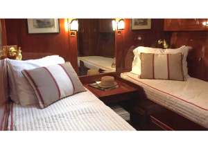 Also aft of the master on the port side is a common head with shower (shared by crew). On the starboard side are two well-appointed guest cabins (one of which are used by the crew), each with over and under single berths, a bureau and hanging locker. These two cabins share the common head and hand-shower.
