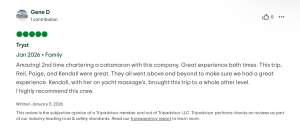● Tip: It is customary to tip your crew at the end of your charter. The amount you leave is totally at your discretion and should be based on the level of service provided. The suggested gratuity is 15%-20% of the total charter fee.