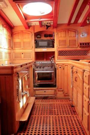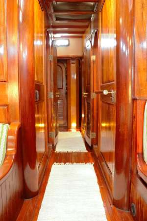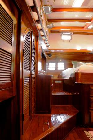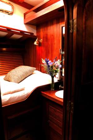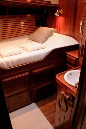 The two forward staterooms have double beds with vanities, hot and cold water sinks, and a vanity mirror. Both staterooms have closets and chests of drawers for clothing storage. The forward stateroom has a fold down writing desk. Each room has its own deck hatch and multiple opening porthole openings for fresh air. Both staterooms have their very own private head and shower.