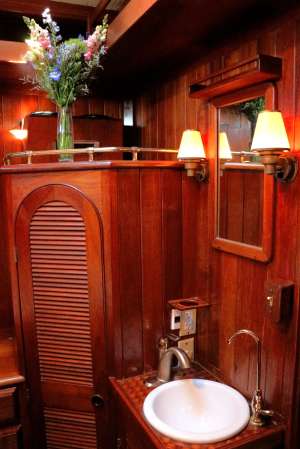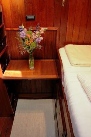 1 Master suite: The Master suite is placed in the stern and provides its occupants with a King bed, plenty of wardrobe space. The King size bed that can be split down the middle for two singles, and an en-suite bathroom with a sink, toilet and shower.