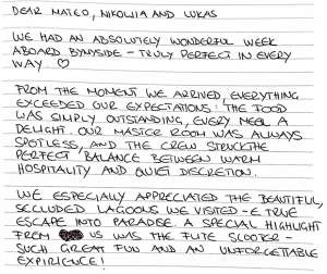 - Reputable and licensed crew who have local knowledge of waters and are able to adjust menus based on guest’s preferences and dietary restrictions
