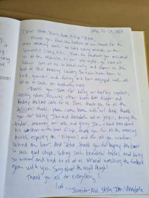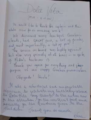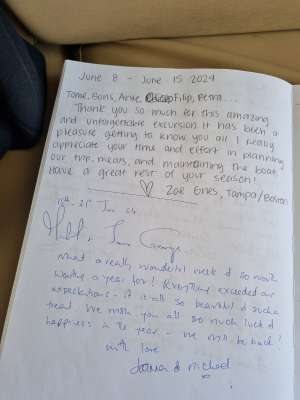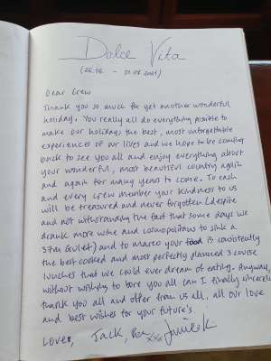 Half board – includes full breakfast and lunch at €590 per person per week (an extra meal can be arranged during the week at €50 per person; full board is not available but two dinners can be offered on board per week)