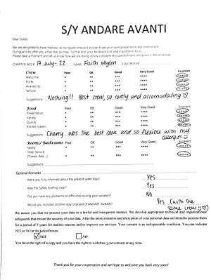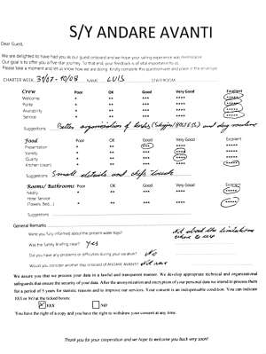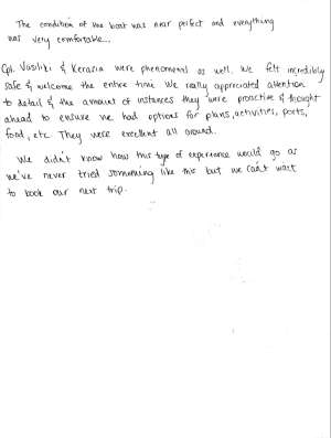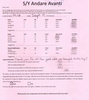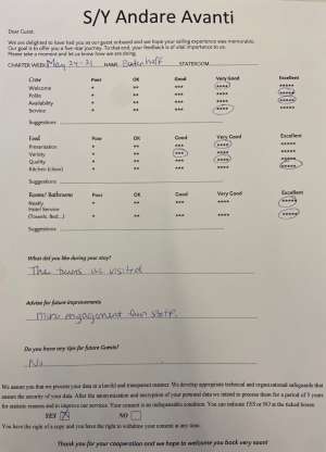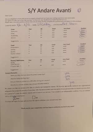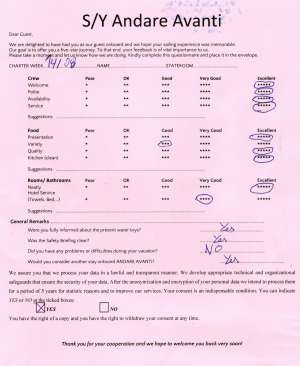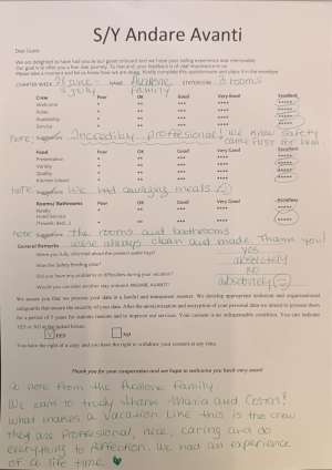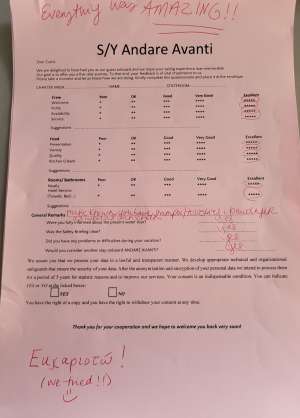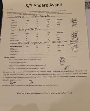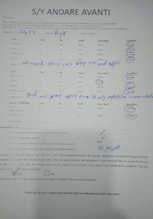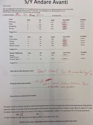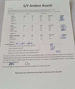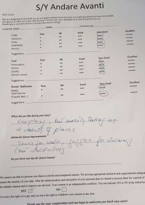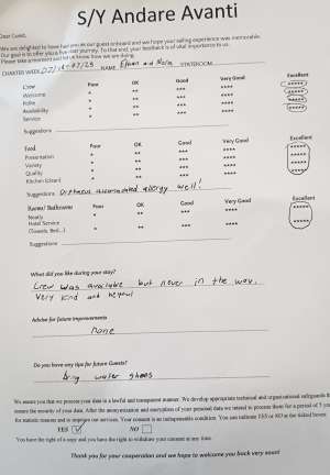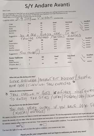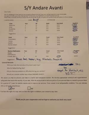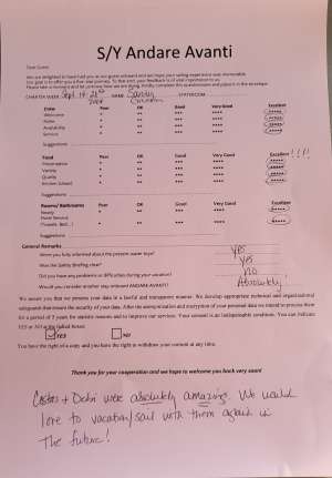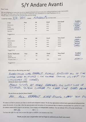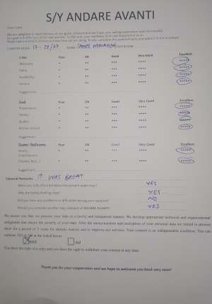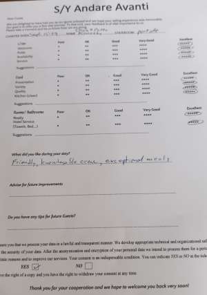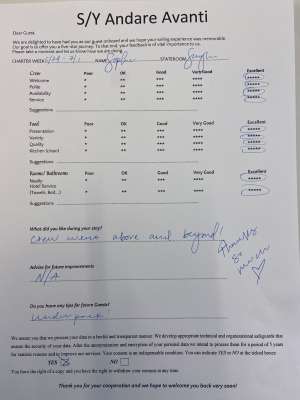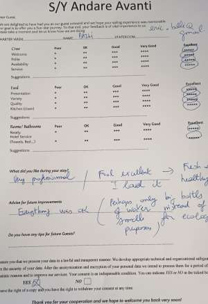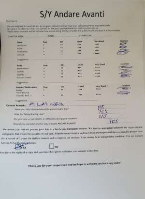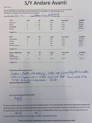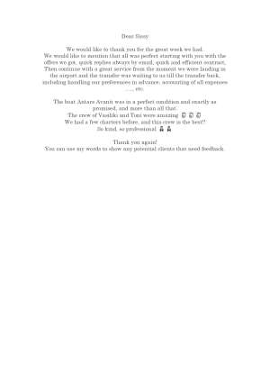 1-22 June, Athens to Corfu Kostas was an excellent Captain. While we gave him our itinerary he was always looking for ideal places to dock for a few hours or overnight. Rather than being in a busy and possibly noisy port we went to sleep and woke in beautiful quiet coves. He was always researching the areas ahead and finding spectacular places. He kept up the APA and shared with Elton every few days as we requested. Kostas always kept up with maintaining and services parts of the boat, keeping everything “ship shape” . I was surprised to see how much a captain is required to know about the mechanics of the boat. He always asked if we needed anything and was available at all hours. Kostas treated Orpheus as a partner and they worked so well together. Orpheus was an excellent Chef. He always asked what we prefer for our meals and worked throughout the day to procure and cook what we liked. His combination of fresh seafood, fruits and vegetables, traditional Greek dishes were excellent. He made sure we had drinks and snacks if we wanted. He worked so well with Kostas assisting with navigating and tying up the boat, or whatever Kostas asked. Orpheus also made sure our sheets were changed and everything was clean. We were fortunate that it was just the two of us so we had time to get to know Kostas and Orpheus; where they grew up, how they got into their current positions and what they want in the future. They really are a great team and. The owner is very fortunate to have a team that works so well together!