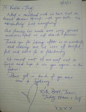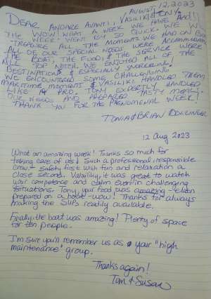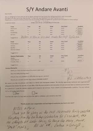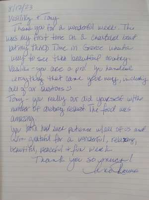 07/06/2024-12/06/2024 "Omg, hands down best trip we have ever had! We absolutely loved Kostas and Maria and it was an amazing time! I will send pics and details later today. Hi Kerry! Took me a couple more days than expected to get back to you again. I got very used to eating at 10pm and going to be at midnight. Coming home to reality kind of stinks. Attached are a few random pics from our trip. As I mentioned, we loved every minute! Kostas and Maria were perfect. We loved them. The boat also suited our family perfectly! We boat a lot on our 25ft center console, but my husband knew nothing of sailing or catamarans. He loved talking with Kostas and learning about the boat and Greece. The rest of the fam also enjoyed Kostas and his story and hospitality. Maria was also amazing. So warm and caring. She cooked us feasts for every meal! It became our running joke as she always referred to everything as a "light" or "small" meal...and they were anything but 😆 I kept desperately trying to work up an appetite because everything was so amazing. That was our only problem...we would want to eat more but would be so full! Such an amazing trip! Very sad to be home. Thank you again for all of your help with coordination and guidance. We could not have asked for a better family vacation ❤️ "