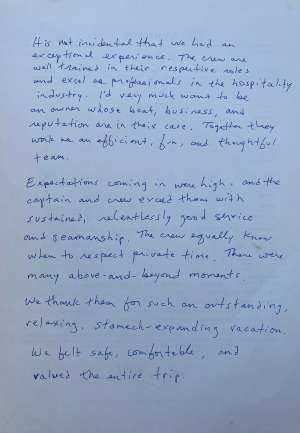 Med Term pricing is cost (cost of the boat) + VAT (country tax) + APA (operating and provisioning expenses). The cost is the weekly rate for the charter. The VAT and APA are calculated on the cost of the boat and paid in addition to that base price. The APA covers: fuel, water, food, licenses, alcohol, and any specific items you would like provided to you. APA money that is not used for provisioning would be reimbursed to you- or, if you spend over the amount, they would charge you. The Captain keeps track of expenses and would let you know if you’re reaching your APA limit. This is the industry standard for the region.