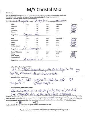 Sat Tv: | Onboard laptop, printer, Wi-fi UNLIMITED Sound system: Onkyo TX - NR686 (inside and cockpit), Artsound in every cabin, Fusion at fly bridge. |