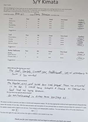 Med Term pricing is cost (cost of the boat) + VAT (country tax) + APA (operating and provisioning expenses). The cost is the weekly rate for the charter. The VAT and APA are calculated on the cost of the boat and paid in addition to that base price. The APA covers: fuel, water, food, licenses, alcohol, and any specific items you would like provided to you. APA money that is not used for provisioning would be reimbursed to you- or, if you spend over the amount, they would charge you. The Captain keeps track of expenses and would let you know if you’re reaching your APA limit. This is the industry standard for the region.