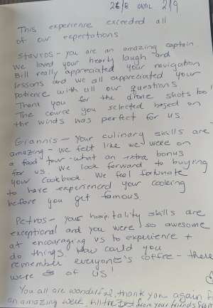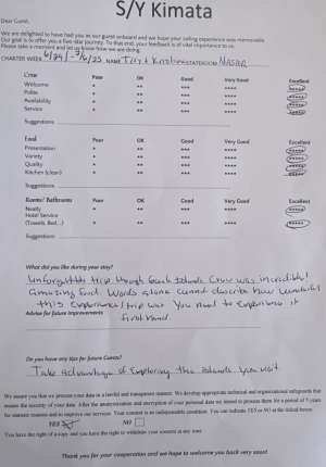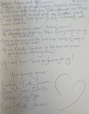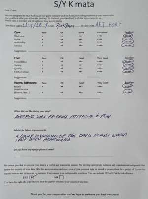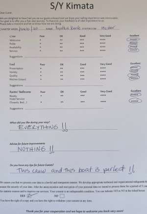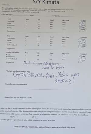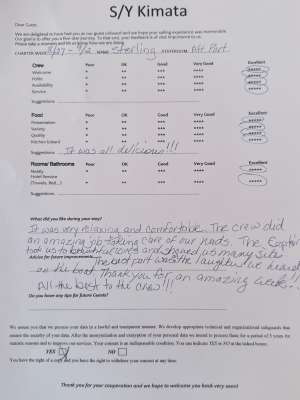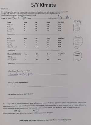 Please note due to logistics, charters with embarkation/disembarkation in Santorini will be charged one extra day + 6,5% VAT.