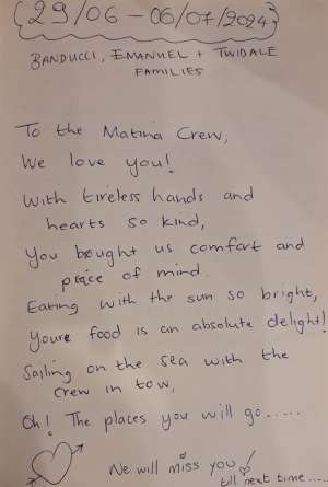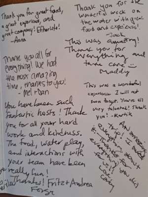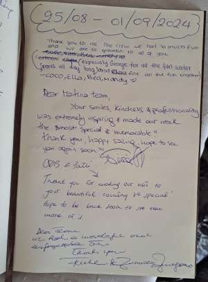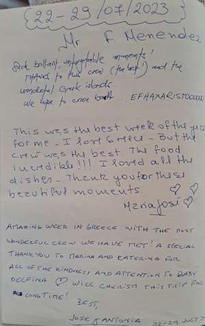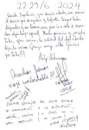 • Half board service 75 EUR per person per day, and full board service 120 EUR per person per day - including local wine and beer with the meals (Any other alcoholic drinks needed will be ordered separately and at the clients' expense.). If we have excessive consumption of alcoholic drinks during the charter, it will be extra, at the Charterer's expense. Soft drinks, coffee, tea and snacks are also included in the above rates.