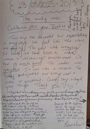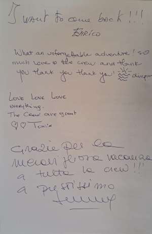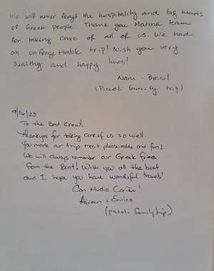 • Half board service 65 EUR per person per day, and full board service 90 EUR per person per day - including local wine and beer with the meals (Any other alcoholic drinks needed will be ordered separately and at the clients' expense.). If we have excessive consumption of alcoholic drinks during the charter, it will be extra, at the Charterer's expense. Soft drinks, coffee, tea and snacks are also included in the above rates.