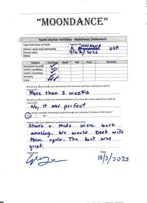 Ladies and gentlemen, allow me to introduce the magnificent Lagoon 46 Moondance, a true gem of the seas. Designed to deliver the utmost luxury and performance, this sleek catamaran offers an unparalleled sailing experience. With its elegant lines and spacious deck layout, Moondance is an embodiment of beauty and functionality. Step aboard, and you'll be greeted by a meticulously crafted interior that exudes contemporary sophistication. The living areas are bathed in natural light, thanks to large panoramic windows that offer breathtaking views of the surrounding waters. The salon is a haven of comfort, featuring plush seating, a stylish dining area, and a state-of-the-art entertainment system, ensuring that every moment spent on board is one of sheer pleasure. Moondance accommodates up to 8 guests in four exquisite cabins, each with its private en-suite bathroom. The cabins are designed with utmost attention to detail, combining luxurious materials and modern amenities to create a peaceful retreat. Whether you're traveling with family or friends, everyone will find their own sanctuary to relax and unwind. When it comes to outdoor living, Moondance truly shines. The spacious flybridge offers a versatile space for sunbathing, socializing, or simply admiring the horizon. Equipped with comfortable seating, it's the perfect spot for alfresco dining while basking in the warmth of the sun. Under sail, Moondance is a true performer. Its innovative design and cutting-edge technology ensure smooth navigation and exhilarating speeds. Whether you're a seasoned sailor or new to the world of yachting, this catamaran offers a thrilling adventure on the open waters. In conclusion, the Lagoon 46 Moondance is a masterpiece of design and craftsmanship, combining elegance, comfort, and performance in perfect harmony. Prepare to be enchanted as you embark on an unforgettable journey aboard this exceptional vessel, where every moment is a celebration of the sea and the joy of sailing.