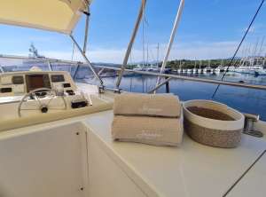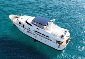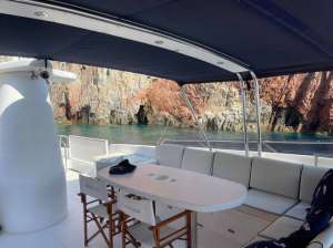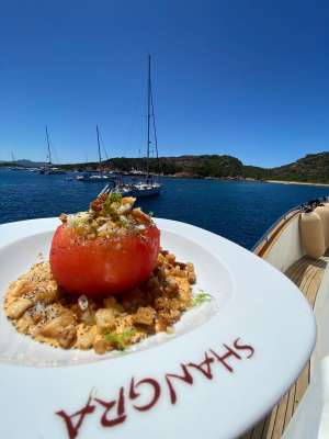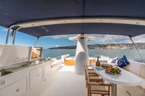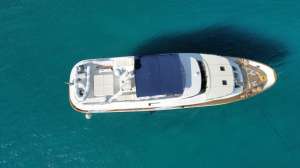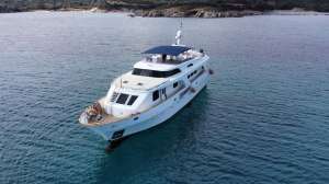 Shangra is a beautiful 26 meters navetta with a classic and elegant design. Access from the main deck goes through a beautiful outdoor dining area, and then continues into the main salon with a lounge area including sofas and a TV and, further, a separate indoor dining area. The kitchen is really wide for a yacht of her size and allows the crew to prepare elaborate culinary creations and to perfectly manage the refreshments service. The lower deck houses the sleeping area divided into: a master cabin with a large double bathroom; a VIP suite with private bathroom; one double cabin with separate beds, all cabins are equipped with ensuite facilities. The most enjoyable outdoor area of the yacht is definitely the sundeck, equipped with solariums, an additional outdoor dining option for 12 and a kitchenette with wetbar and grill. Thanks to high quality Naiad stabilizers, Shangra guarantees a quiet and pleasant cruising.